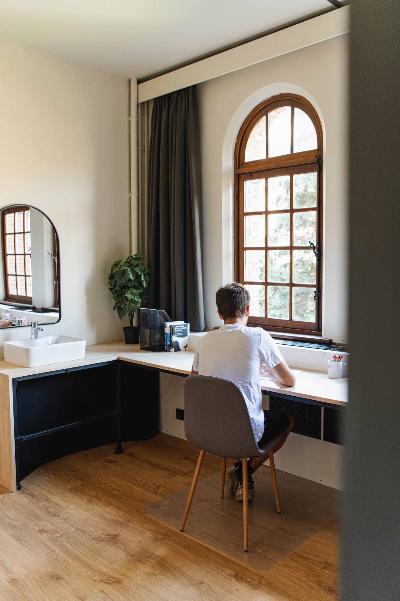 Een rustig en sereen gemeenschapskot met grote kamers in de oude abdijstijl én moderne studiefaciliteiten.